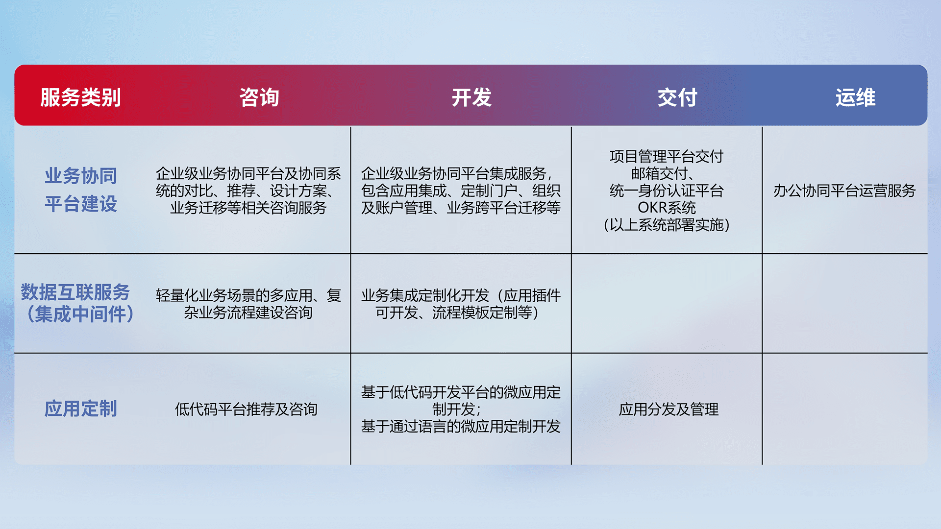 针对钉钉、、、、企微、、、IDaas等平台级产品提供产品的规划、、方案、、交付、、、定制化开发等服务,,实现如统一协同办公、、、、智能客户服务、、混合会议管理、、、、智能数据查询、、、等业务场景,,实现数字化转型。。